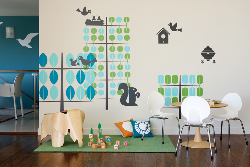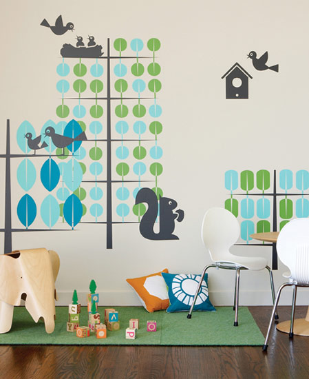 Le pack Trees/Arbres présenté ici contient au total 109 stickers muraux pour décorer et transformer radicalement une chambre d'enfant avec un décor contemporain composé d'arbres, de feuilles, d'oiseaux et d'un écureu ...